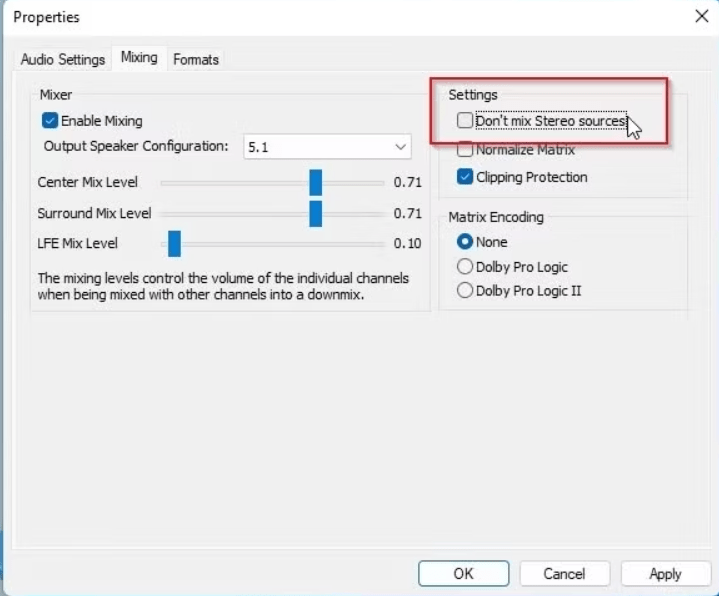 This is what the LAV Filter Mixing Settings does for your media player. You will see a basic explanation about the mixing abilities of the LAV filters. Download the lav filter on this website as well as read the article on the LAV Filter Audio Settings as well.